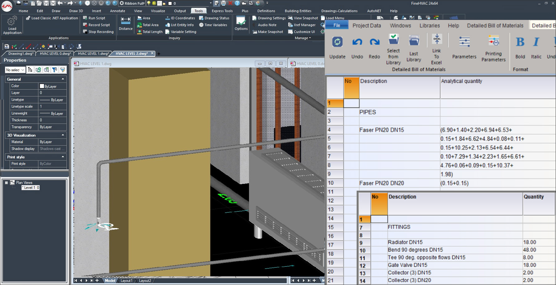 Among the main new features of FINE24 are a total redesign on top of the latest ITC and ODA libraries, compatibility with Revit, enhanced supervision, faster display engine with respect to the 3D building model, enriched dialogs, the AutoBLD (for the building shell) and AutoNET (for the piping networks) command groups, new material libraries on top of the Firebird platform, more detailed bill of materials, a large expansion of the network calculation spreadsheets, and many others.