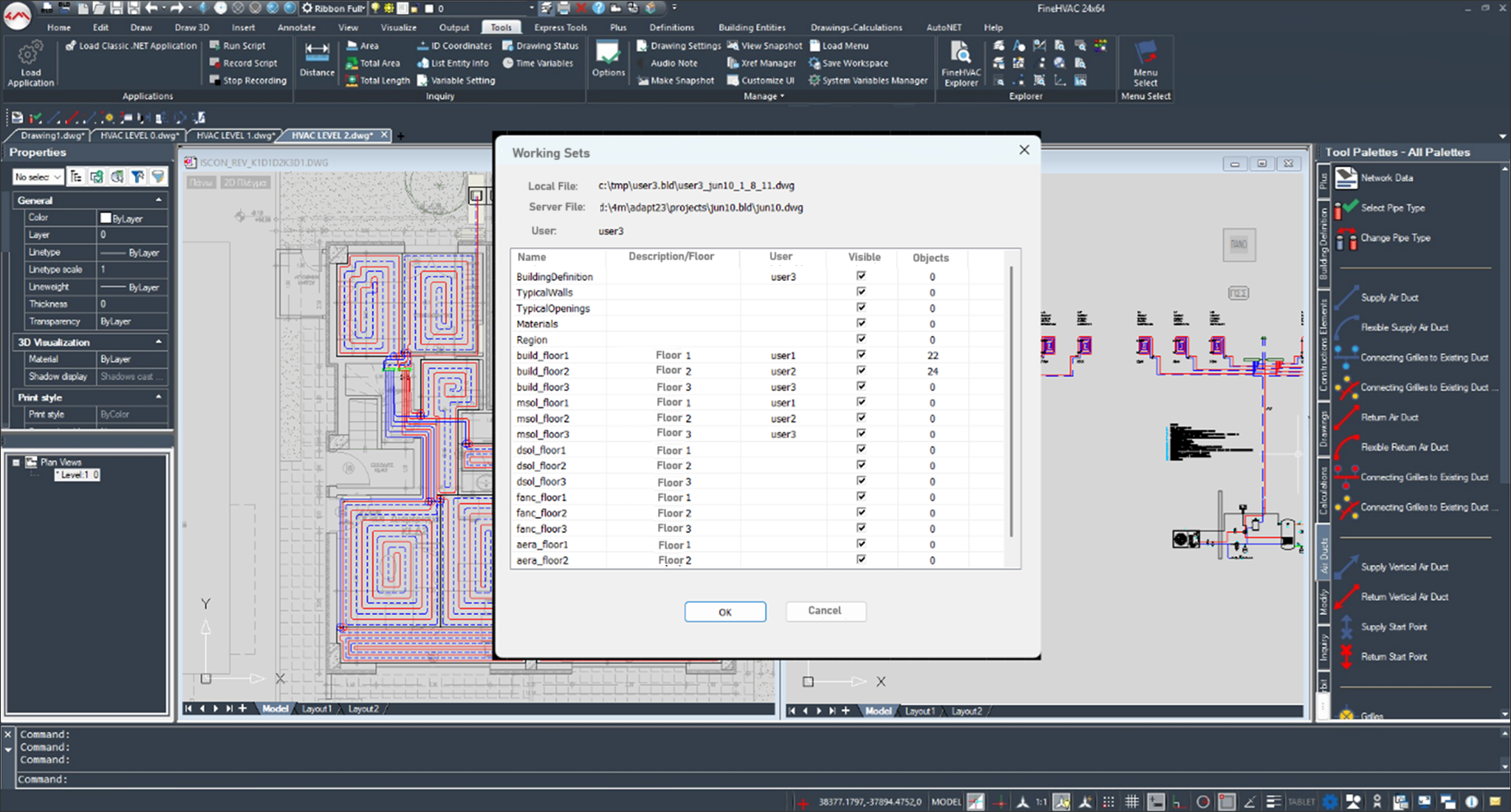 Depending on the specifics of the project design, users can agree on a collaboration plan of maximum efficiency, sharing the worksets of the design process. For example, one user can process the building levels and spaces, a second one can use this data in order to calculate the thermal and cooling loads of the building, a third user can design the airduct network, and so on.